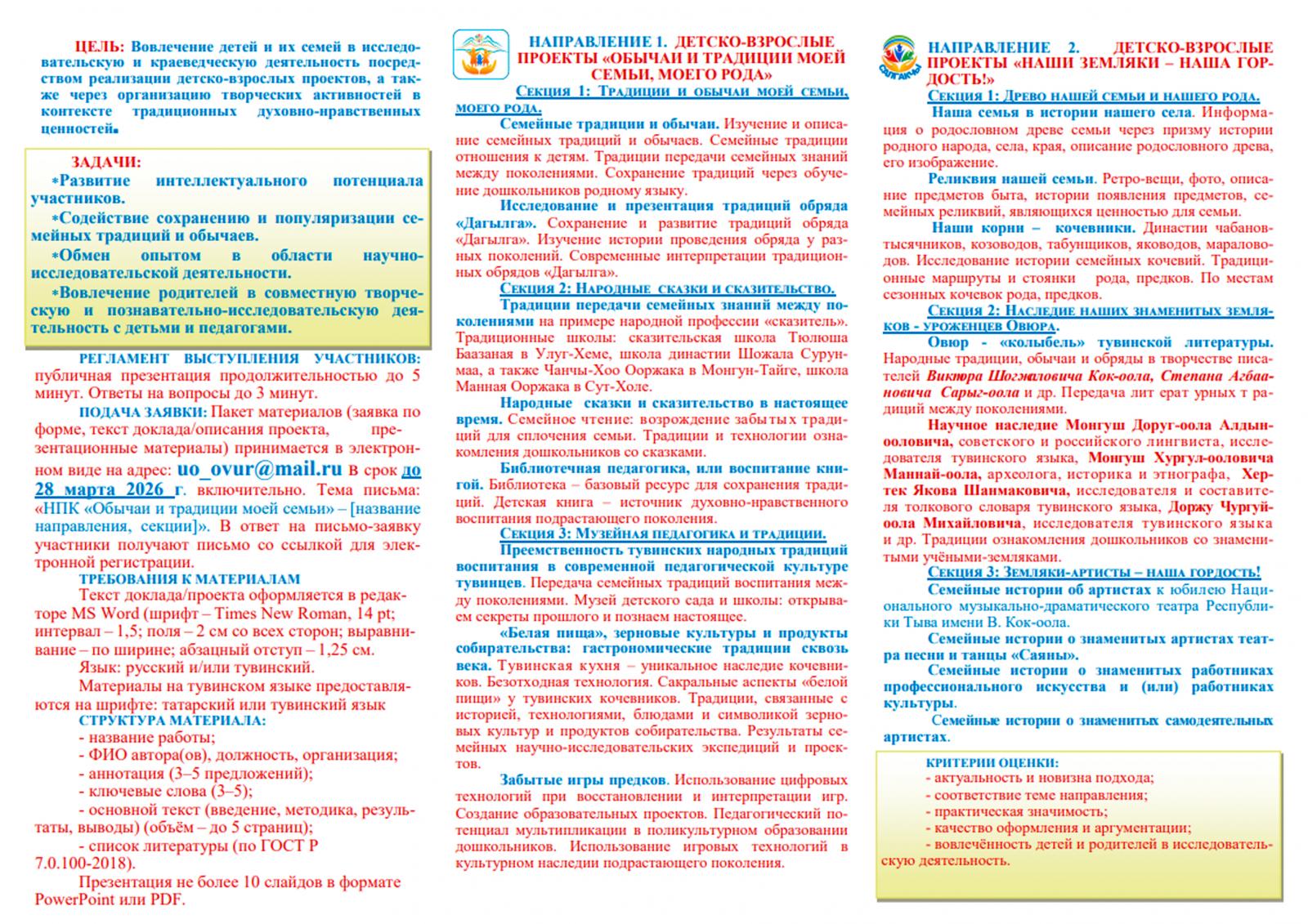 Конференция пройдёт 28 апреля 2026 года в рамках реализации плана мероприятий Десятилетия науки и технологий на территории Республики Тыва на 2022-2031 годы и губернаторского проекта «Наука – детям», во исполнение плана мероприятий Года дошкольного образования в системе образования Республики Тыва, во исполнение приказа Министерства образования Республики Тыва от 19 января 2026 года №26/д «Об организации и проведении Всероссийской научно-практической конференции с международным участием «Обычаи и традиции моей семьи», в рамках реализации инновационной проектной деятельности МБДОУ Детский сад «Чечек» комбинированного вида с.Хандагайты Овюрского кожууна на тему «Детско-взрослые проекты в пространстве традиционных духовно-нравственных ценностей в семье, детском саду, социуме».